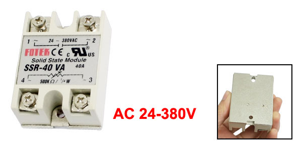 Product Name Solid State Module Relay Type SSR-40VA Material Metal, Plastic, Electric Parts Rated Current 40A Output AC 24-380V Resistance 500KΩ Mounting Hole Size Small Dia: 4.5mm/0.17", Big: 7 x 4.3mm/0.27" x 0.16"(L*W) Relay Size 6.2 x 4.4 x 2.3cm/ 2.4" x 1.7" x 0.9"(L*W*T) Main Color Silver Tone, Gray Weight 104g Package Content 1 x Solid State Module Relay - Reviews