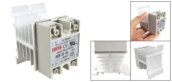 Product Name Solid State Relay + Heat Sin Model SSR-10AA Material Metal, Aluminum, Plastic Input 80-250V AC Output 24-380V AC Rated Current 10A Total Size (Approx.) 8 x 5 x 7.3cm / 3.1" x 1.9" x 2.8" (L * W * H ) Color As Picture Shown Weight 209g Package Content 1 x Solid State Relay