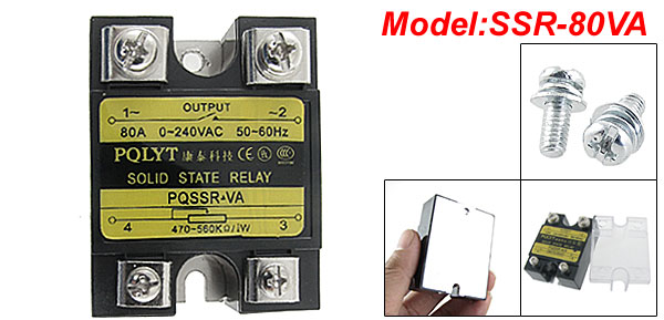 Product Name Solid State Relay Volt Resistance Regulator Model SSR-80VA Output 0-240V AC, 50-60Hz, 80A Input Control Methods 470-560KΩ / 1/4W Potentiometer(Potentiometer is Not Included) Size (Approx.) 4.55 x 6 x 3.2cm / 1.8" x 2.3" x 1.2" (L*W*T) Hole in Base Dia 0.43cm / 0.169" Color As Picture Shown Material Metal, Plastic, Electric Parts Weight 122g Package Content 1 x Solid State Relay Volt Resistance Regulator 2 x Fixed Screw - Reviews