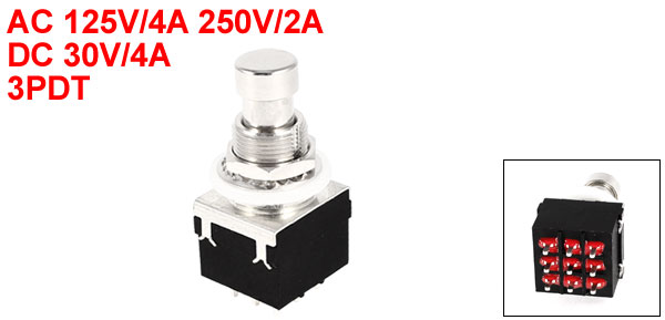 Product Name Guitar Effects Pedal Footswitch Model ST9PX02L Contact Type 3PDT, 9Pin, Momentary Rated Voltage / Current AC 125V/4A 250V/2A, DC 30V/4A Size 18 x 14 x 40mm / 0.7" x 0.6" x 1.6"(L*W*H) Weight 20g Color Silver Tone, Black Package Content 1 x Guitar Effects Pedal Footswitch - Reviews