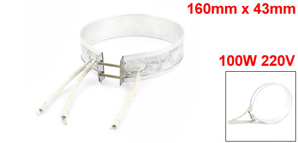 Product Name Band Heater Material Stainless Steel, Ceramic Power 100W Voltage 220V Band Size 160x 43mm / 6.3" x 1.7" (Inner Dia.*H) Braid Lead Length (Each) 9cm / 3.5" Color White, Silver Tone Net Weight 155g Package Content 1 x Stainless Steel Band Heater - Reviews