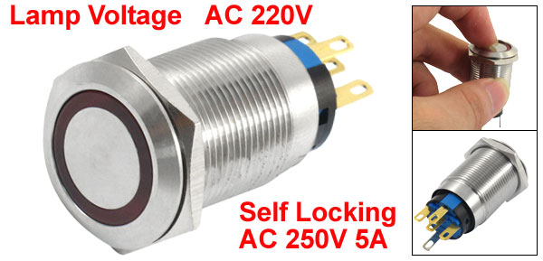Item Name Stainless Steel Push Button Switch Operation Type Self Locking Contact 1NO 1NC Head Design Flat Round Lamp Voltage AC 220V Switch Rating AC 250V 5A Operation Pressure 2.5-4N Lamp Color Red Pin Number 5 Thread Diameter 17mm/0.6'' Total Size 40 x 25mm/1.5'' x 0.9''(L*Max.W) Material Stainless Steel, Electric Parts Housing Color Silver Tone Net Weight 22g Package Content 1 x Stainless Steel Push Button Switch - Reviews