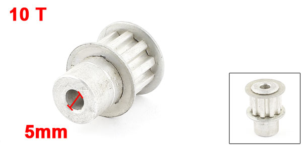 Product Name Timing Pulley Type XL Tooth Number 10 Pitch 5mm / 0.2" Bore Diameter 5mm / 0.2" Fit Belt Width 11 mm / 0.43" Overall Size 19 x 25 mm / 0.75" x 1" (D*H) Material Stainless Steel Color Silver Tone Weight 13g Package Content 1 x Timing Pulley - Reviews