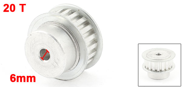 Product Name Timing Pulley Type XL Tooth Number 20 Pitch 6mm / 0.24" Bore Diameter 6mm / 0.24" Fit Belt Width 11 mm / 0.43" Overall Size 36 x 25 mm / 1.4" x 1" (D*H) Material Stainless Steel Color Silver Tone Weight 50g Package Content 1 x Timing Pulley - Reviews