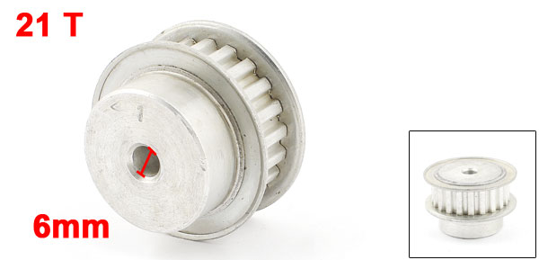 Product Name Timing Pulley Type XL Tooth Number 21 Pitch 6mm / 0.24" Bore Diameter 6mm / 0.24" Fit Belt Width 11 mm / 0.43" Overall Size 39 x 25 mm / 1.5" x 1" (D*H) Material Stainless Steel Color Silver Tone Weight 59g Package Content 1 x Timing Pulley - Reviews