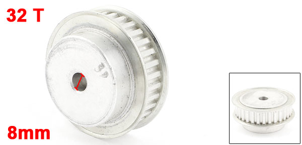 Product Name Timing Pulley Type XL Tooth Number 32 Pitch 6mm / 0.24" Bore Diameter 8mm / 0.31" Fit Belt Width 11 mm / 0.43" Overall Size 56 x 25 mm / 2.2" x 1" (D*H) Material Stainless Steel Color Silver Tone Weight 128g Package Content 1 x Timing Pulley - Reviews