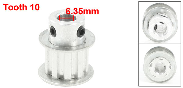 Product Name Timing Pulley Type XL10 Number of Tooth 10 Pitch 1.5mm/ 1/16'' Overall Size 19 x 22mm/2'' x 0.86''(D*H) Bore Diameter 6.35mm/ 1/4" Fit Belt Width 11mm/0.43'' Material Aluminum Color Silver Tone Weight 9g Package Content 1 x Timing Pulley - Reviews