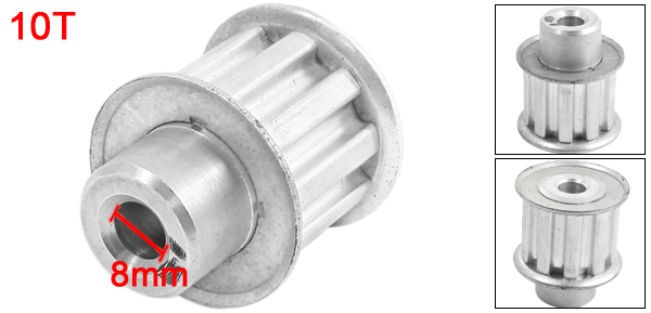 Product Name Timing Pulley Type L10 Tooth Number 10T Pitch 9.5mm /3/8" Pitch Dia 29.5mm/1.2" Bore Diameter 8mm /0.31" Bore Outside Diameter 19mm /0.75" Fit Belt Width 21mm /0.83" Overall Size 34 x 39mm /1.3" x 1.6" (D*H) Material Aluminum Alloy Color Silver Tone Weight 54g Package Content 1 x Timing Pulley - Reviews