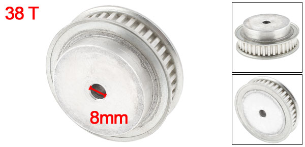 Product Name Timing Pulley Material Aluminum Color Silver Tone Number of Tooth 38T Pitch 3mm/0.12" Bore Diameter 8mm/0.315" Top Diameter 48mm/1.8" Overall Size 66 x 25mm/2.6" x1"(D*H) Fit Belt Width 11mm/0.43" Weight 129g Package Content 1 x Timing Pulley - Reviews