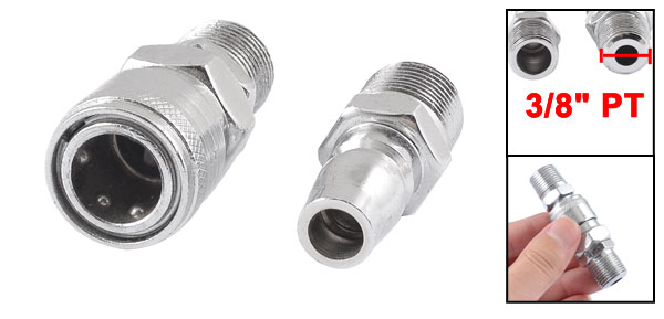 DetailsStraight 3/8" PT Male Thread Air Quick Coupler Adapter Connector Fitting  Product Name Air Quick Coupler Male Thread Size 3/8" PT Male Thread End Dia 16 x 7.5mm/ 0.62" x 0.29"(Outside Dia* Inside Dia) 16 x 11mm/ 0.62" x 0.43"(Outside Dia* Inside Dia) Overall Size 74 x 22mm / 2.9" x 0.8" (L * Max.D) Color Silver Tone Material Metal Weight 83g Package 1 x Air Quick Coupler
