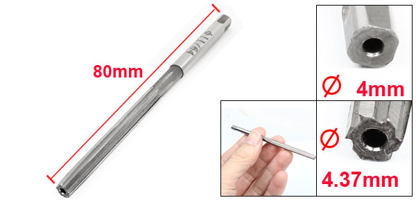 Product Name Straight Shank Chucking Reamer Material HSS Flute Number 6 Square Head Size 4 x 4mm/ 5/32" x 5/32" (L*W) Cutting Diameter 4.37mm/ 11/64" Cutting Depth 40mm/ 1 19/32" Shank Diameter 4mm/ 5/32" Total Length 80mm/ 3.1" Color Silver Tone Weight 29g Package Content 1 x Straight Shank Chucking Reamer - Reviews