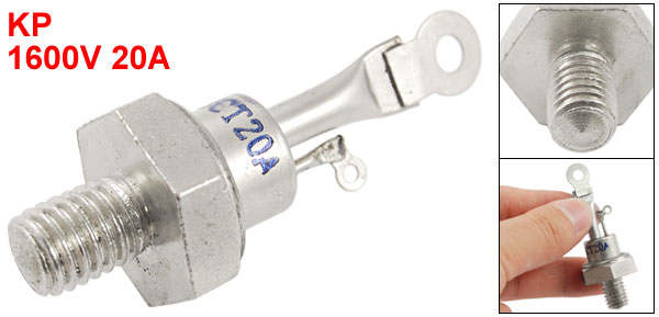 Product Name Silicon Rectifier Model KP Average Forward Current 20A Repetitive Peak Reverse Voltage 1600V Thread Dia(Approx) 9.8mm/0.4'' Hole Dia. 4mm/0.16'' Overall Size(Approx) 61 x 21mm/2.4'' x 0.8'' (L*Hex Size) Material Metal Color Silver Tone Net Weight 31g Package Content 1 x Silicon Rectifier - Reviews