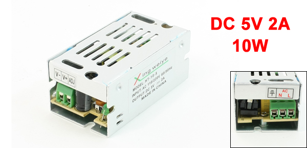 Product Name Switching Power Supply Input AC 110/220V 50/60Hz Output DC 5V, 2A Power 10W Overall Size 7x 4 x 3cm / 2.75" x 1.57" x 1.1" (L*W*T) Case Material Metal, Aluminum Case Color Silver Tone Net Weight 73g Package Content 1 x Switching Power Supply - Reviews
