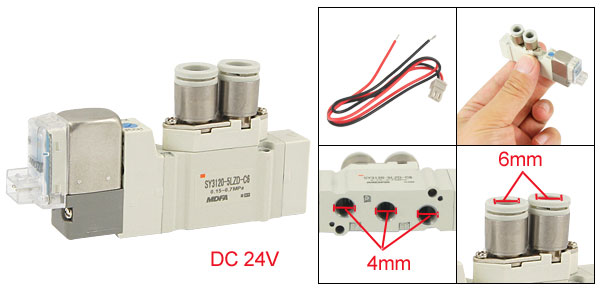 DetailsSY3000 DC 24V Push Turn Locking Lever Solenoid Valve  Product Name Solenoid Valve Model No. SY3120-5LZD-C6 Actuation Type 2 Position Single Pilot Type Internal Pilot Lead Wire L Plug Connector w Lead Wire Wire Length 29cm / 11.4" Rated Voltage DC 24V Thread Port Size 4mm / 0.157" One-touch Fitting Port Size 6mm / 0.157" Operating Pressure Rage 0.15-0.7MPa Manual Override Style Push-turn Locking Lever Overall Size 7.6 x 1 x 3.7cm / 3" x 0.4" x 1.4"(L*W*H) Material Metal & Plastic Color Gray & Silver Tone Net Weight 57g Package Content 1 x Solenoid Valve