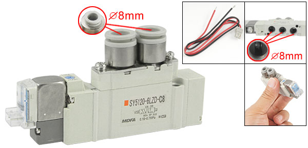 Product Name Solenoid Valve Model No. SY5120-6LZD-C8 Actuation Type 2 Position Single Pilot Type Internal Pilot Lead Wire L Plug Connector w Lead Wire Wire Length 29cm / 11.4" Rated Voltage DC12V Thread Port Size 8mm / 0.315" One-touch Fitting Port Size 8mm / 0.315" Operating Pressure Rage 0.15-0.7MPa Surge Suppressor Type Light & Surge Voltage Suppressor Manual Override Style Push-turn Locking Lever Overall Size 9.5 x 1.5 x 4.4cm / 3.7" x 0.6" x 1.7"(L*W*H) Material Metal & Plastic Color Gray & Silver Tone Net Weight 79g Package Content 1 x Solenoid Valve - Reviews