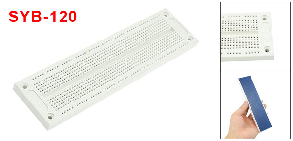 Product Name Solderless Breadboard Model SYB-120 Point Quantity 700 Hole Dia(Approx) 1mm/ 0.039" Hole Pitch(Approx) 1.4cm / 0.055" Wire Size 29-20AWG Matrix 12 Rows x 60 Columns Board Size(Approx) 17.5 x 4.5 x 0.8cm/ 6.9" x 1.8" x 0.31" (L*W*T) Srew Hole Size 3.4mm/0.134" Srew Hole Pitch 3cm/1.2" Material ABS Plastic, Metal Color White, Blue Weight 68g Package Content 1 x Solderless Breadboard - Reviews