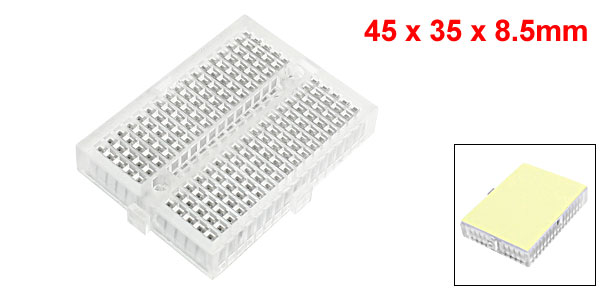 Product Name Mini Bread Board SYB-170 Fit Wire Type 20-29 AWG Total Size 45 x 35 x 8.5mm/ 1.8" x 1.4" x 0.33"(L*W*T) Materials ABS Plastic, Phosphor Bronze Nickel Plated Main Color Clear Weight 16g Package Content 1 x Mini Bread Board SYB-170 - Reviews