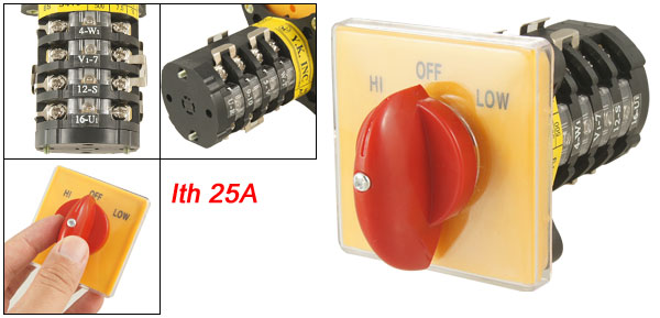 Product Name Cam Switch Model No. T-16EXF64D-4 Voltage & Power AC220V, 3.7kW AC380V, 5.5kW AC500V, 7.5kW AC1 20A Ith 25A Terminals Quantity 16 Installing Holes Dia 3.8mm / 0.150" Installing Size 48 x 48mm / 1.90" x 1.90"(L*W) Overall Size 64 x 64 x 115mm / 2.5" x 2.5" x 4.5" (L*W*H) External Material Plastic Color Red, Black & Yellow Net Weight 203g Package Content 1 x Universal Switch - Reviews