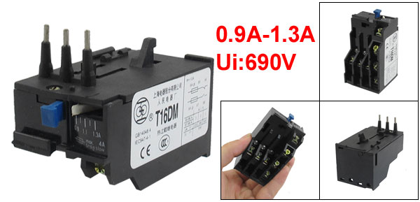 DetailsT16DM 3 Pole 0.9A-1.3A Current Range Motor Thermal Overload Relay 1NO 1NC  Product Name Thermal Overload Relay Model T16DM Thermal Contact 1 NO(97-98), 1 NC(95-96) Pole Number 3 Pole Thermal Relay Rated Current 1.3A Adjustable Current Range 0.9A-1.3A Operation Current 6A Ue(AC-15) 220/380/500V Ui (AC-15) 690V Ith 10A Material Plastic, Electronic Components Total Size (Approx) 6 x 4.3 x 7.9cm / 2.4" x 1.7" x 3.1" (L*W*H) Color Black Net Weight 105g Package Content 1 x Thermal Overload Relay