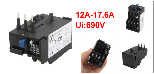 Product Name Thermal Overload Relay Model T16DM Thermal Contact 1 NO(97-98), 1 NC(95-96) Pole Number 3 Pole Thermal Relay Rated Current 17.6A Adjustable Current Range 12A-17.6A Operation Current 6A Ue(AC-15) 220/380/500V Ui (AC-15) 690V Ith 10A Material Plastic, Electronic Components Total Size (Approx) 5.8 x 4.3 x 7.9cm / 2.3" x 1.7" x 3.1" (L*W*H) Color Black Net Weight 105g Package Content 1 x Thermal Overload Relay - Reviews