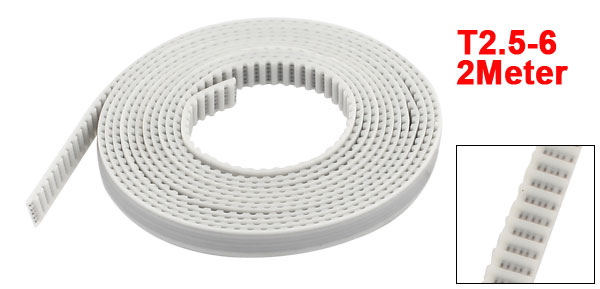 Product Name Timing Belt Model T2.5-6 Teeth Pitch 2.5mm / 0.1" Belt Width 6mm / 0.24" Belt Length 2Meter/ 78.7"(6.6Ft) Design Open Ended Material Polyurethane(PU) Color White Weight 20g Package Content 1 x Timing Belt - Reviews