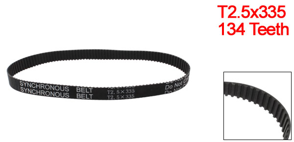 DetailsT2.5x335 134-Tooth 10mm Width Black Industrial Synchronous Timing Belt 13.2"  Product Name Timing Belt Model T2.5x335 Number of Teeth 134 Pitch 2.5mm / 0.1" for Belt Pulley 10mm Belt Width 10mm / 0.4" Pitch Line Length 335mm/13.2" Material Rubber Color Black Weight 5g Package Content 1 x Timing Belt