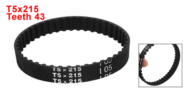 Product Name Timing Belt Model T5x215 Number of Teeth 43 Pitch 5mm / 0.2" Belt Width 10mm / 0.4" Pitch Line Length 215mm/ 8.5" Material Rubber Color Black Weight 6g Package Content 1 x Timing Belt - Reviews