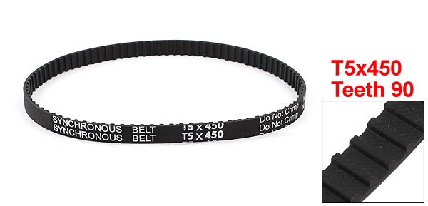 Product Name Timing Belt Model T5x450 Number of Teeth 90 Teeth Pitch 5mm / 0.2" Belt Width 10mm / 0.4" Belt Girth 450mm/ 17.7" Material Rubber Color Black Weight 7g Package Content 1 x Timing Belt - Reviews