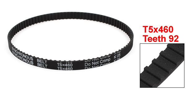 Product Name Timing Belt Model T5x460 Number of Teeth 92 Teeth Pitch 5mm / 0.2" Belt Width 10mm / 0.4" Belt Girth 460mm/ 18.1" Material Rubber Color Black Weight 9g Package Content 1 x Timing Belt - Reviews
