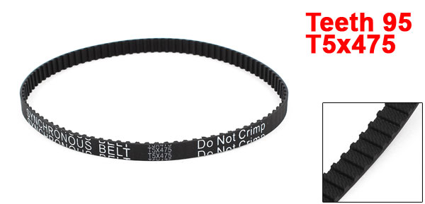 Product Name Timing Belt Model T5x475 Number of Teeth 95 Teeth Pitch 5mm / 0.2" Belt Width 10mm / 0.4" Belt Girth 475mm/ 18.7" Material Rubber Color Black Weight 8g Package Content 1 x Timing Belt - Reviews