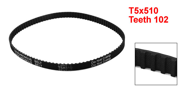 Product Name Timing Belt Model T5x510 Number of Teeth 102 Teeth Pitch 5mm / 0.2" Belt Width 10mm / 0.4" Belt Girth 510mm/20" Material Rubber Color Black Weight 16g Package Content 1 x Timing Belt - Reviews