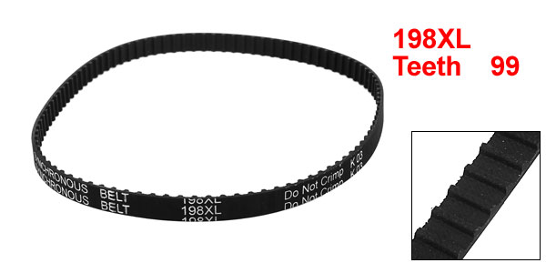 Product Name Timing Belt Model 198XL Number of Teeth 99 Code Number 037 Teeth Pitch 5.08mm / 0.2" Belt Width 9.5mm / 0.37" Pitch Length 502.92mm/ 19.8" Material Rubber Color Black Weight 8g Package Content 1 x Timing Belt - Reviews