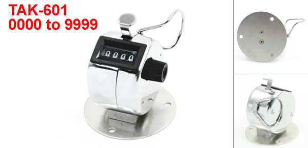 Product Name Hand Tally Counter Model No. TAK-601 Count Range 0000 to 9999 Body Size 4.6 x 3.1cm/ 1.8" x 1.2" (D * H) Base Dia 56mm/2.2" Mounted Hole Dia 4mm/0.16" Overall Height 6.1cm/ 2.4" Material Metal, Plastic Color Silver Tone, Black Weight 94g Package Content 1x Hand Tally Counter - Reviews