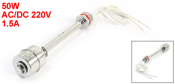 DetailsTank Aquarium 26mm Ball Dia Vertical Water Level Control Sensor Floating Switch  Product Name Float Switch Max Contact Rating 50W Max Switching Voltage AC/DC 220V Max Switching Current 1.5A Max Breakdown Voltage DC 300V Max Carry Current 3A Max Contact Resistance 100mΩ Temperature Rating -30 ~ +180 °C Float Ball Material Stainless Steel Float Body Material Stainless Steel Float Ball Size(Approx) 26 x 26mm / 1" x 1"(L*D) Thread Dia(Approx) 9.7mm / 0.37" Nut Dia(Approx) 17mm / 0.7" Bottom Clip Dia(Approx) 15mm / 0.6" Body Total Length 140mm / 5.5" Cable Length 28cm / 11" Color Silver Tone Net Weight 60g Package Content 1 x Float Switch