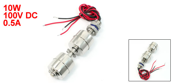 DetailsTank Pool Liquid Water Double Balls Sensor Stainless Steel Float Switch  Product Name Water Level Sensor Contacts NO+NC Max Contact Rating 10W Max Switching Voltage 100V DC Max Switching Current 0.5A Max Breakdown Voltage 220V DC Max Carry Current 1.0A Max Contact Resistance 100mΩ Temperature Rating -30 ~ +125 °C Float Ball Material SUS304 Float Body Material SUS304 Float Ball Size(Approx) 26 x 26mm / 1.02" x 1.02"(L*D) Thread Dia(Approx) 9.7mm / 0.382" Hex Nut Size(Approx) 16.6mm / 0.654" 16.8mm / 0.661" Body Total Length(Approx) 140.5mm / 5.5" Bottom Clip Dia(Approx) 14.5mm / 0.571" Cable Length 31cm / 12.2" Color Silver Tone Net Weight 53g Package Content 1 x Water Level Sensor