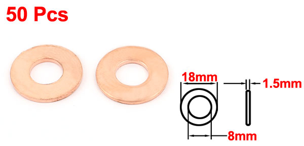 Product Name Copper Washer Inner Diameter 8mm/0.31" Outer Diameter 18mm/0.71" Thickness 1.5mm/0.06" Material Copper Color Copper Tone Weight 122g Package Content 50Pcs(+/-2%) x Copper Washer - Reviews