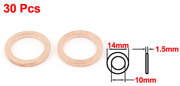 Product Name Copper Washer Inner Diameter 10mm/0.4" Outer Diameter 14mm/0.55" Thickness 1.5mm/0.06" Material Copper Color Copper Tone Weight 25g Package Content 30Pcs x Copper Washer - Reviews