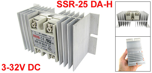 Product Name Solid State Relay + Heat Sink Model No. SSR-25 DA-H Load Current 25A Load Voltage 90-480V AC Control Voltage 3-32V DC Mounting Hole Diameter 5mm / 0.2" Total Size (Approx.) 126 x 70 x 52mm / 5.0" x 2.8" x 2.0" (L*W*H) Heatsink Material Aluminum Color Silver Tone Weight 272g Package Content 1 x Solid State Relay + Heat Sink - Reviews