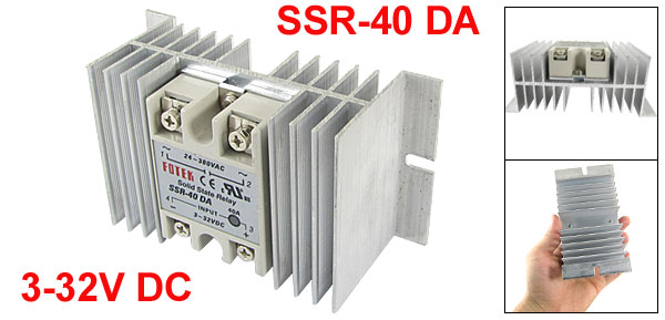 Product Name Solid State Relay + Heat Sink Model No. SSR-40 DA Load Current 40A Load Voltage 24-380V AC Control Voltage 3-32V DC Mounting Hole Diameter 5mm / 0.2" Total Size (Approx.) 126 x 70 x 52mm / 5.0" x 2.8" x 2.0" (L*W*H) Heatsink Material Aluminum Weight 294g Package Content 1 x Solid State Relay + Heat Sink - Reviews