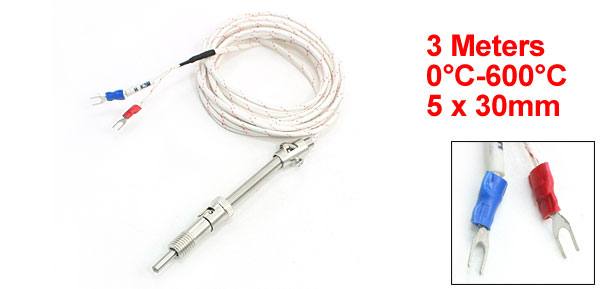 Product Name Thermocouple Type K Type, Tension Spring Sleeve Temperature Range 0°C-600°C Probe Size 5 x 30mm/ 0.2" x 1.2" (D*L) Thread Diameter 12mm/ 0.47" Cable Length 3 Meters / 9.8Ft Net Weight 80g Package Content 1 x Thermocouple - Reviews