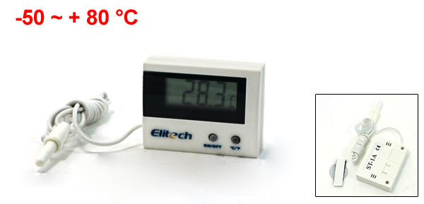 Product Name Digital Thermometer Temperature Range -50 ~ + 80 °C Precision ±1 °C Power Supply 1 x LR44 Cell Button(Not Included) Size(Approx.) 5.5 x 4.1 x 1.5cm/ 2.2" x 1.6" x 0.6"(L*W*T) Cable Length 1m / 3.3 Ft Casing Material Plastic Color White Weight 48g Package Contents 1 × Digital Thermometer - Reviews