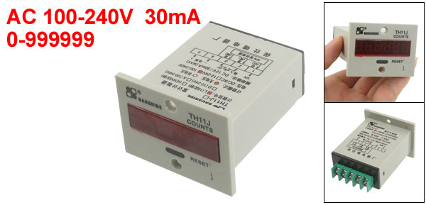 Product Name Digital Counter Model TH11J-L Digit Display 6 Screw Terminal Quantity 5 Rated Voltage 100-240VAC Auxiliary Output 12VDC 30mA Max Count Signal No Voltage Count Range 0-999999 Mounting Hole Diameter 3.5mm /0.142" Total Size(Approx) 5.6 x 4.2 x 7.6cm / 2.2" x 1.66" x 3" (L*W*H) External Material Plastic, Metal Main Color Gray Weight 63g Package Content 1 x Digital Counter - Reviews