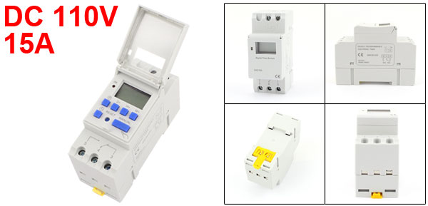 DetailsTHC15A DC 110V Digital LCD Weekly Programmable Timer Time Relay Switch  Main Color Light Gray Net Weight 115g Brand DMiotech Country of Manufacture CHINA Package Content 1 x Digital Time Switch Inductive Load 5A Mounted Type 35mm DIN Rail Material Plastic, Electric Part Rated Coil DC 110V AC Switch Capacity AC 250V 15A Total Size 90 x 36 x 65mm/3.5" x 1.4" x 2.5"(L*W*H) Working Voltage AC 220V-240V 50/60Hz