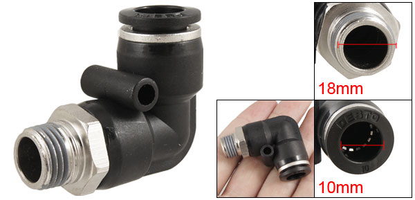 Product Name Pneumatic Fitting Model DPL10-02 Tube OD 10mm / 0.394" Thread OD 18mm / 0.709" Total Size(Approx) 43 x 18 x 36mm / 1.7" x 0.7" x 1.4"(L*W*H) External Material Plastic & Metal Color Black & Silver Tone Net Weight 24g Package Content 1 x Pneumatic Fitting - Reviews