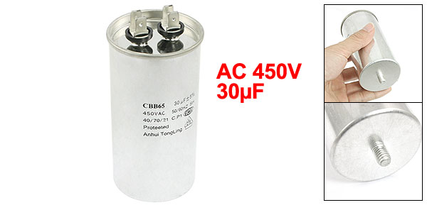 Product Name Motor Capacitor Model CBB65 Type Polypropylene Film Capacitor Material(External) Metal Rated Capacitance 30uF Tolerance ±5% Rated Frequency 50/60Hz Operating Temperature 40/70/21 Rated Voltage AC 450V Size 10 x 5cm/ 4" x 2" (L * D) Thread Diameter 7.6mm/ 0.3" Color Silver Tone Weight 173g Package Content 1 x Motor Capacitor - Reviews