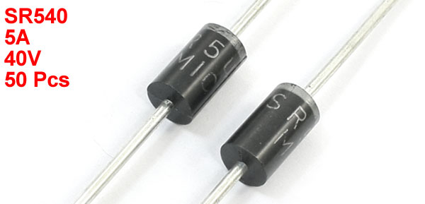 Product Name Schottky Diode Model SR540 Current 5A Reverse Voltage 40V Lead Size(Each Side) 1 x 2.5mm/0.04" x 0.1"(D*L) Body Size 5 x 9mm/0.2" x 0.35"(D*L) Color Black Weight 48g Package Content 50Pcs(±%2) x Schottky Diodes - Reviews