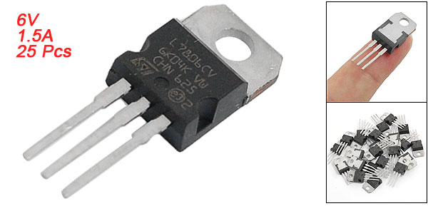 Product Name Voltage Regulator Model No. L7806 Output Voltage 6V Output Current 1.5A Package Type TO220 Mounting Hole Diameter 3.2mm/ 0.126" Total Size 29 x 10 x 4.5mm/ 1.14" x 0.39" x 0.18" (L*W*H) Color Black, Silver Tone Material Metal, Plastic Weight 50g Package 25 x Voltage Regulator - Reviews