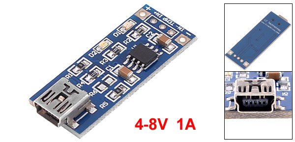 Product Name Lithium Battery Charging Module Model TP4056 Input Voltage 4-8V Output Charging Current(Max.) 1A Total Size 39 x 15 x 5mm/1.5" x 0.59" x 0.2"(L*W*T) Material PCB, Iron, Plastic Main Color Blue Weight 4g Package Content 1 x Lithium Battery Charging Module - Reviews