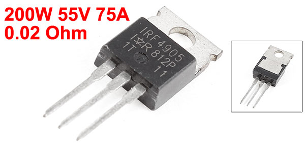 Product Name MOSFET Model No. IRF4905 Channel Type P-Channel Pin Quantity 3 Power 200W Drain Source Voltage 55V Drain Current 75A Package Type TO-220 Resistance 0.02 Ohm Mounting Hole Diameter 3.6mm/ 0.14" Total Size 29x 10 x 4mm/1.1" x 0.39" x 0.16" (L*W*H) Weight 3g Package 1 x P-Channel Power MOSFET - Reviews