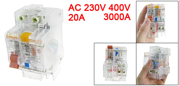 Product Name Earth Leakage Circuit Breaker Features Transparent, 35mm Din Rail Mount Rated Voltage AC 230V/400V Number of Poles 1P+N Rated Current 20A Rated Breaking Capacity 3000A Rated Residual Operating Current <=30mA Rated Residual Non-operating Current <=15mA Rated Residual Operating Time <= 0.1s Overall Size 94 x 44 x 72mm / 3.7" x 1.7" x 2.8"(L*W*H) Material Plastic, Electric Components Weight 174g Package Content 1 x Earth Leakage Circuit Breaker - Reviews